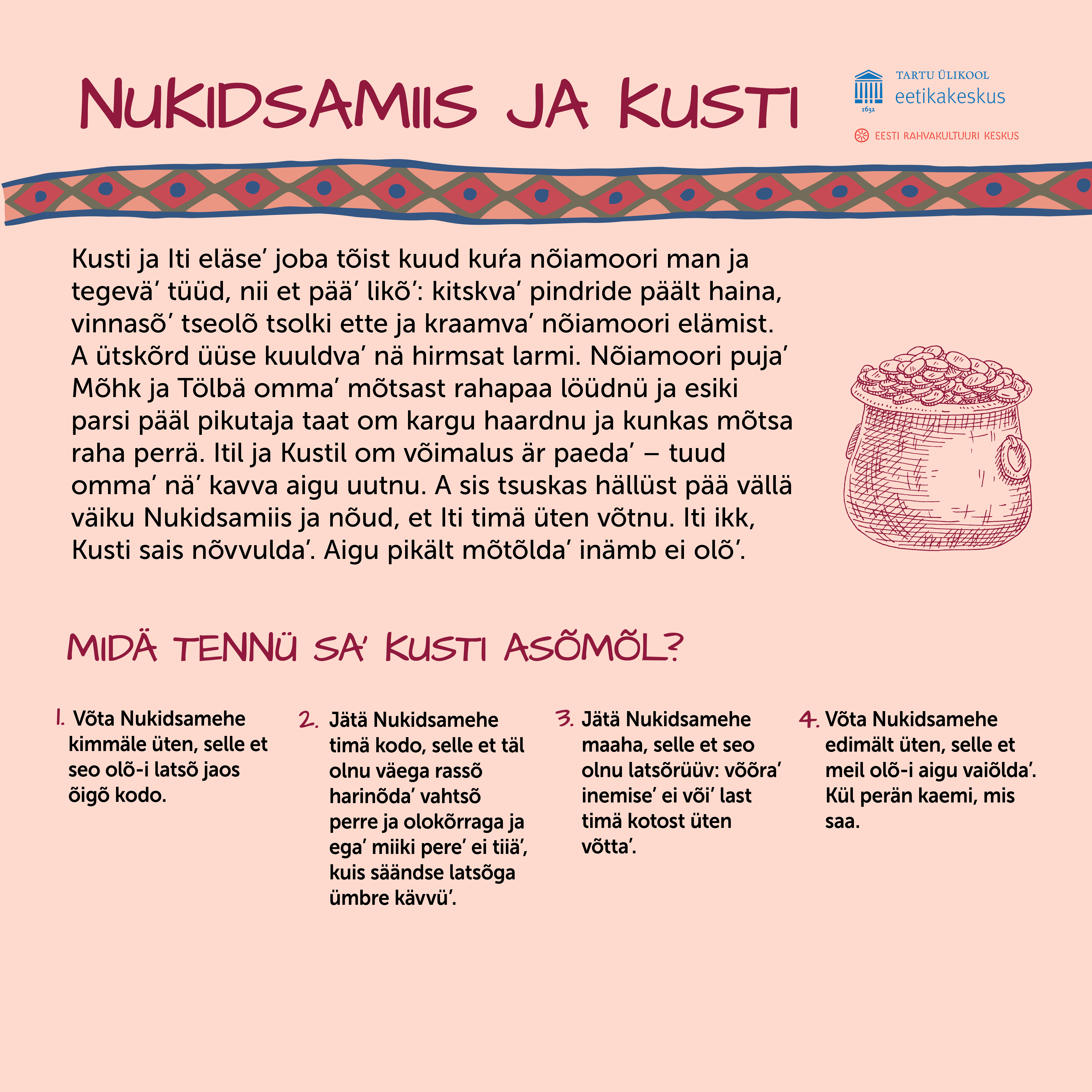Seo om väärtüisi mäng. Loe’ lugu läbi ja mõtlõ’, määntse variandi sa’ esi’ valinu’. Kõnõlõ’ tõisilõ, mille sa niimuudu valit. Kullõ’ hoolõga, midä tõsõ’ ütlese’. Naaku-ui vasta vaidlõma vai naarma – egäl inemisel om õigus arvada’ õkva nii, nigu timä taht. Ku sa saa-ai häste arvo, sis küsü’ seletüst. Hää olnu’, ku kõik joudnu’ mängo lõpus üte meele pääle, a tuu üle tohe-ei hääletust tetä’. Ku üte meele pääle siski ei jovva’, om tähtsä vällä märki’, et inemise’ ommaki esi’muudu ja mi ei piäki kõik üttemuudu mõtlõma, a luku tulõ pitä’ tõistmuudu arvajist kah.