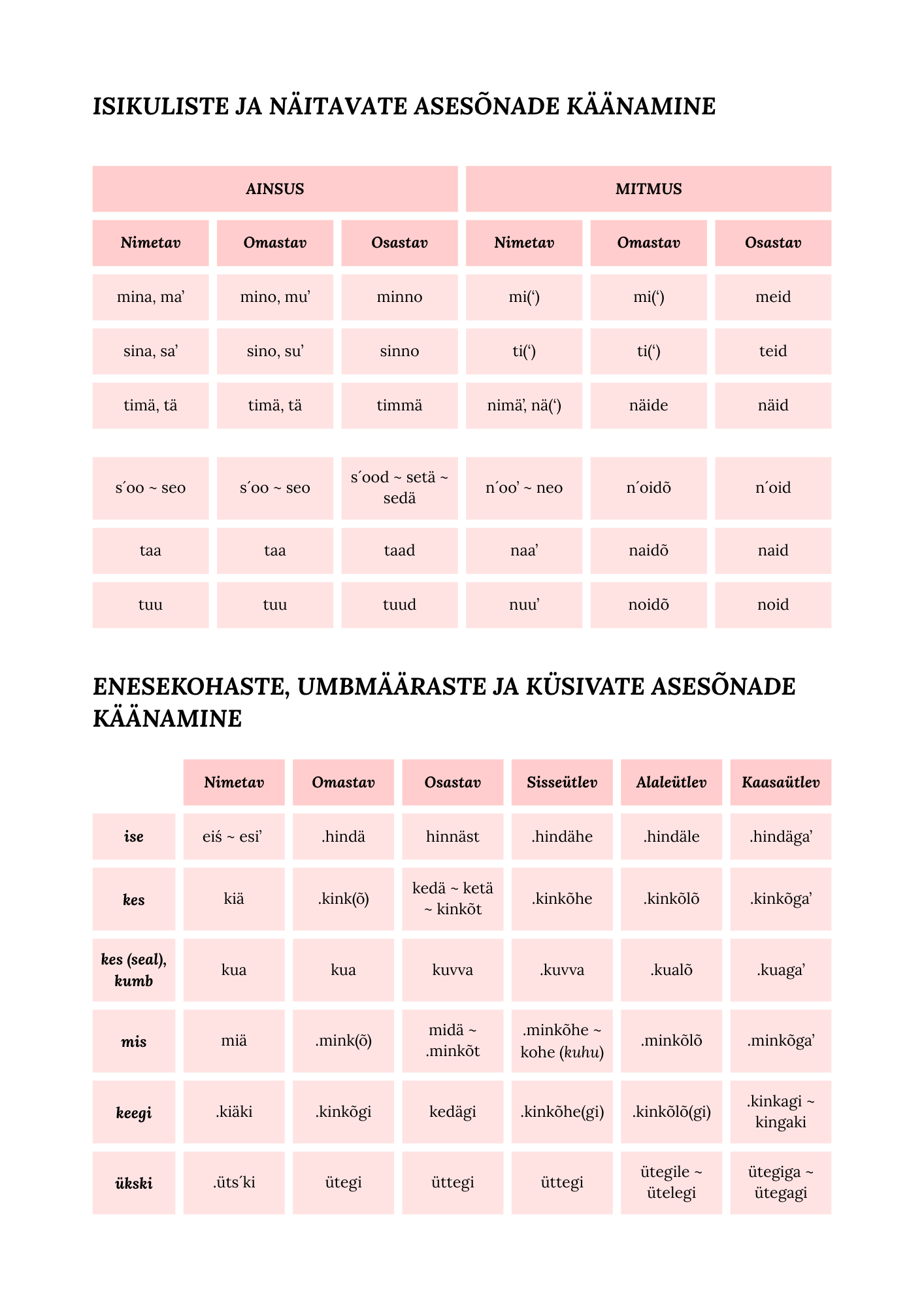 Välläprinditava’ tabõli’ omma’ peri raamadust “Seto keele teejuht” koh om isigulistõ’ ja näütäväte asõsõnno’ ja hindäkohastõ’, umbmääräste’ ja küüsüväte asõsõnno käänämisõ põhimõtte’.
